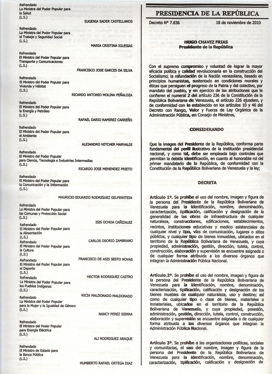 TEXTO del Decreto Nº 7.836 del 18NOV2010, Uso Imagen Presidente República 22/11/2010 Ricardo A. Carbonell Cornejo Fichas TEXTO del Decreto Nº 7.836 del 18NOV2010Uso Imagen Presidente República Compártelo Twitter Facebook LinkedIn Correo electrónico Whatsapp Comments (2) sera por lo de los 100 millones de dolares recolectados para acabar…con su imagen??? sera por lo de los 100 millones de dolares recolectados para acabar…con su imagen??? Los comentarios están cerrados.