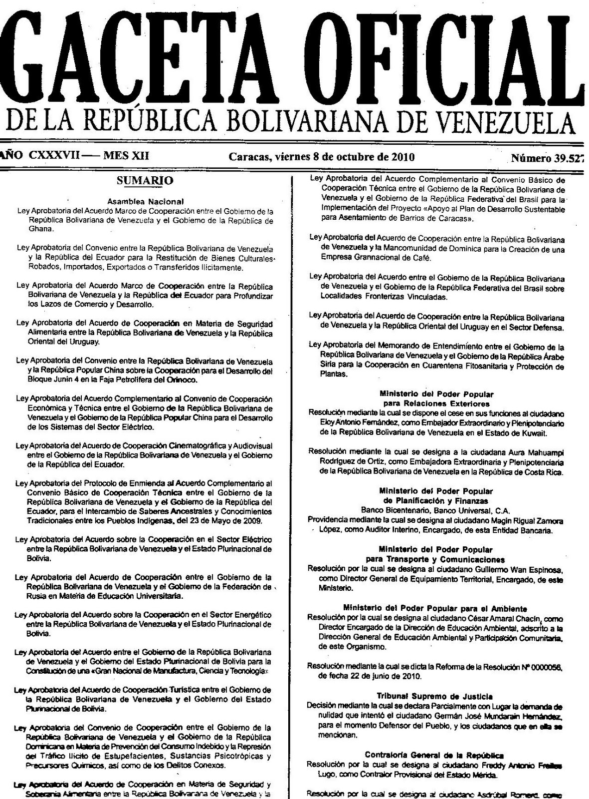 SUMARIO GO 39.527 del 8OCT2010 11/10/2010 Ricardo A. Carbonell Cornejo Fichas Compártelo Twitter Facebook LinkedIn Correo electrónico Whatsapp