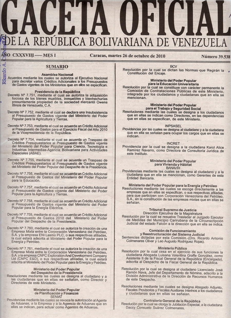 SUMARIO GO 39.538 del 26OCT2010 27/10/2010 Ricardo A. Carbonell Cornejo Fichas SUMARIO GO 39.538 del 26OCT2010 Compártelo Twitter Facebook LinkedIn Correo electrónico Whatsapp