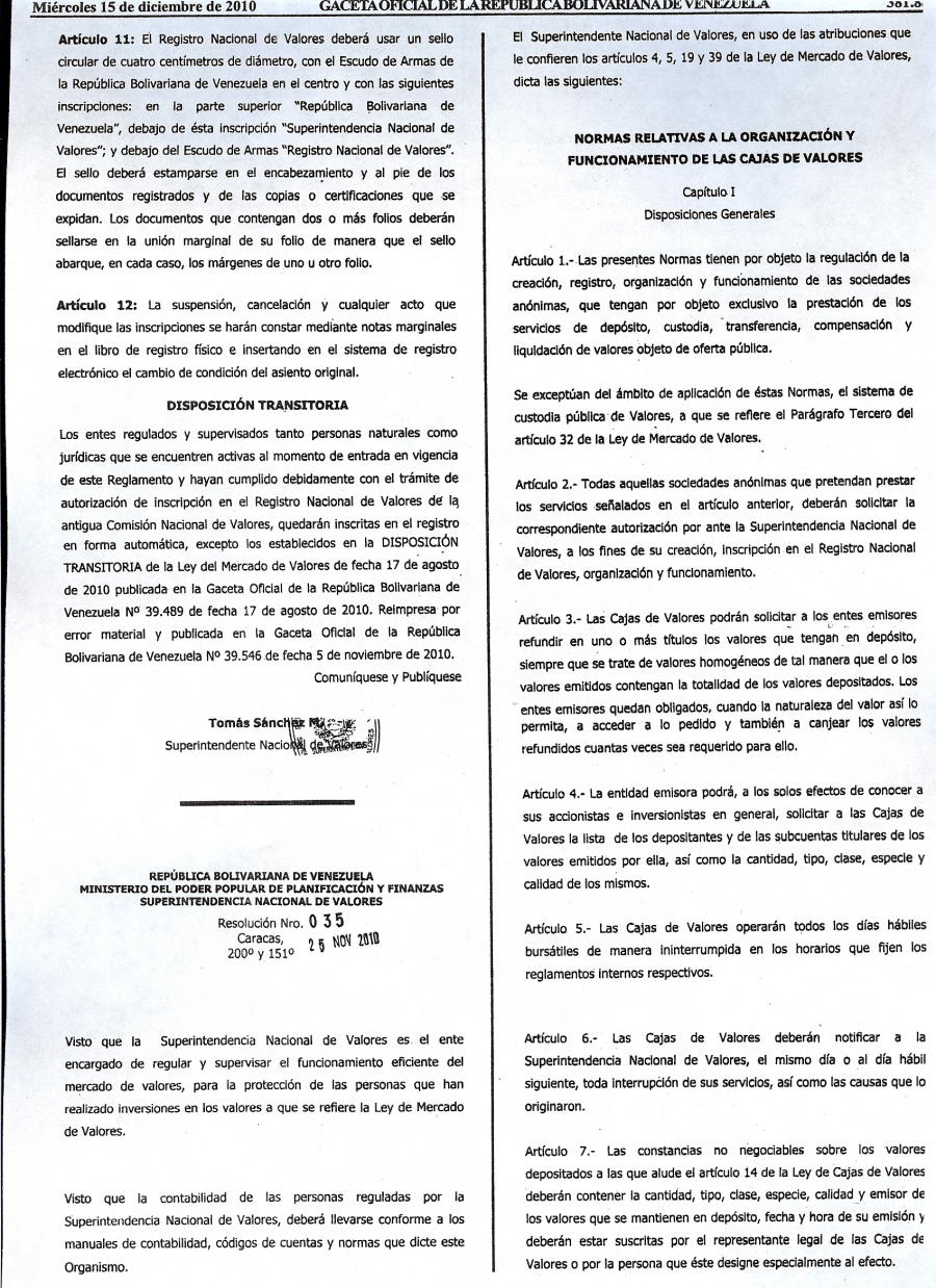 TEXTO de NORMAS dictadas por SNV (antes CNV) publicadas en GO # 39.574 del 15DIC2010 16/12/2010 Ricardo A. Carbonell Cornejo Fichas TEXTO de NORMAS dictadas por SNV (antes CNV) publicadas en GO # 39.574 del 15DIC2010 Compártelo Twitter Facebook LinkedIn Correo electrónico Whatsapp