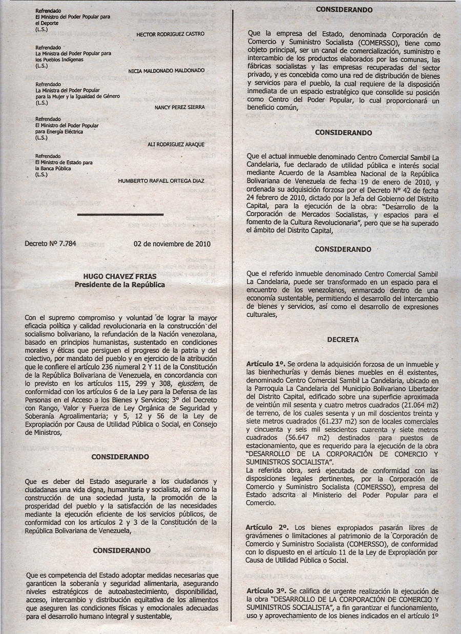 TEXTO Decreto Nº 7.785 del 2NOV10 EXPROPIACIÓN Centro Comercial Sambil La Candelaria